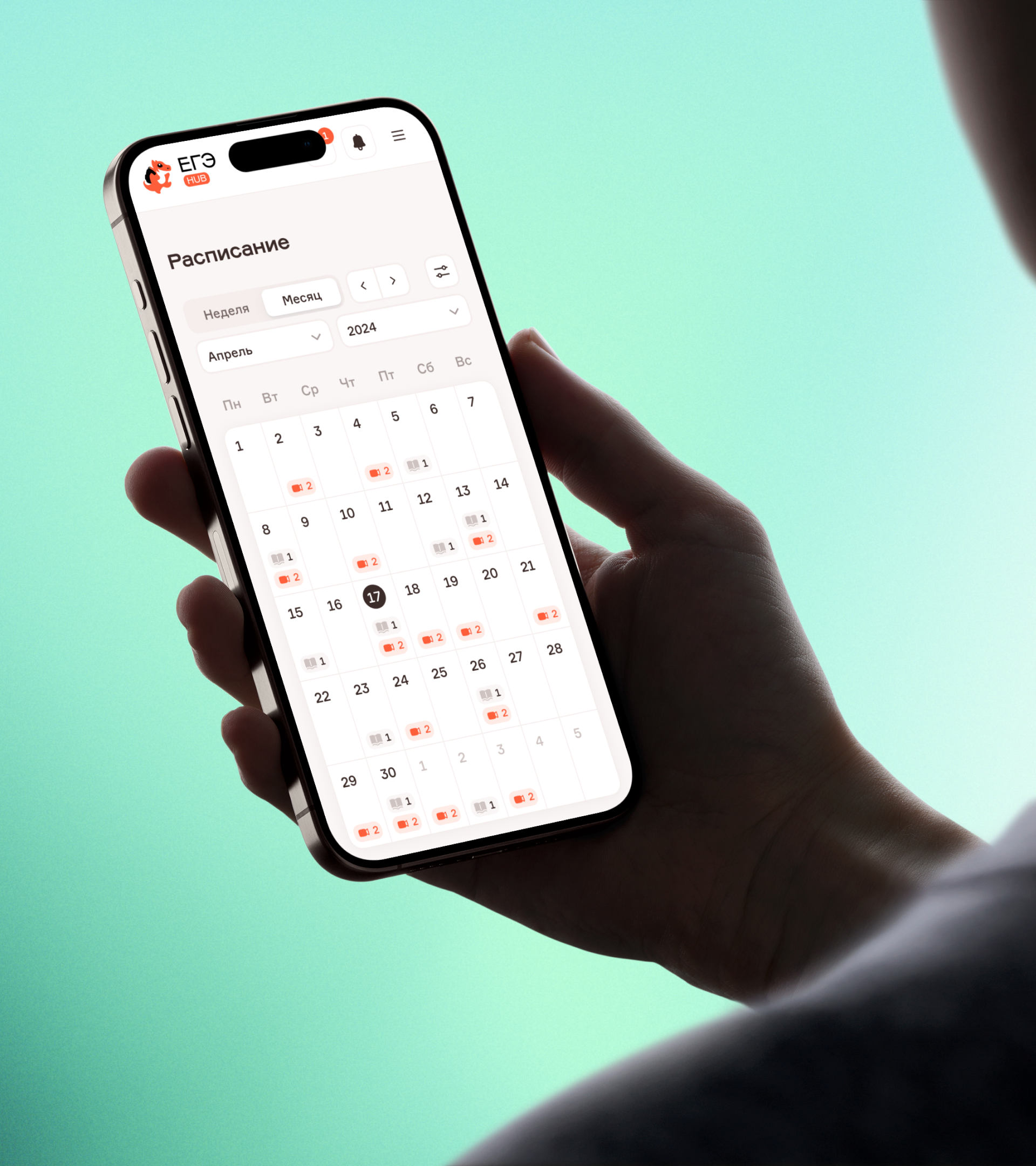 Расписание представлено в календаре на месяц, неделю и день. В нём отмечены даты и время уроков и домашних заданий.