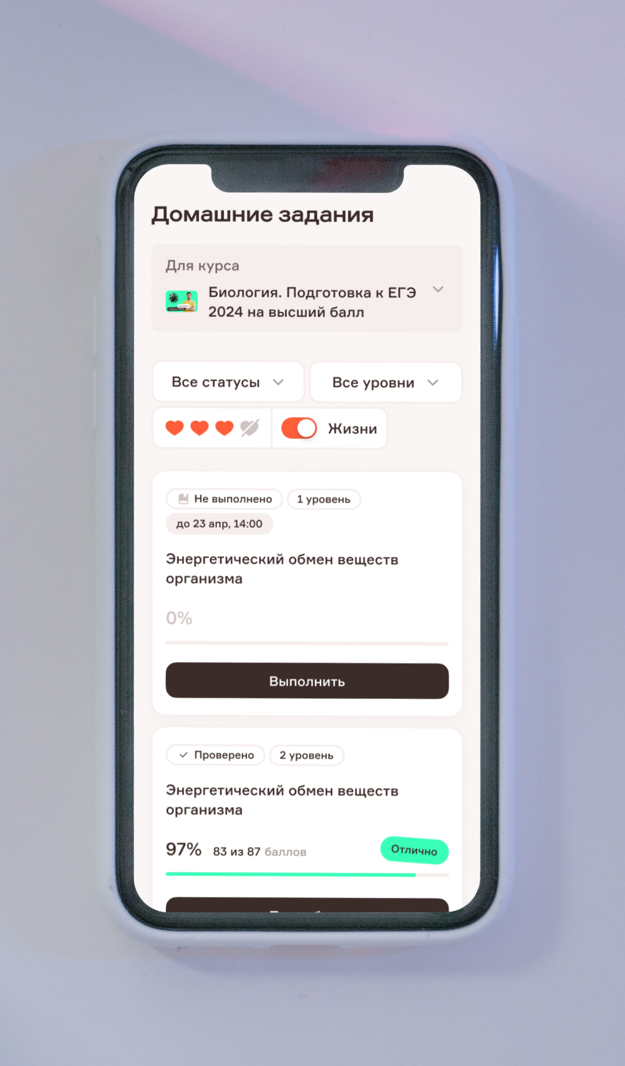 После прохождения урока ученик получает доступ к домашним заданиям, сгруппированным по курсу, статусу и уровню сложности для удобства навигации. Задания имеют два уровня сложности и ограничены по времени. Если ученик не решает задания вовремя, у него сгорает «жизнь». Вернуть её можно, решив оба уровня задания.