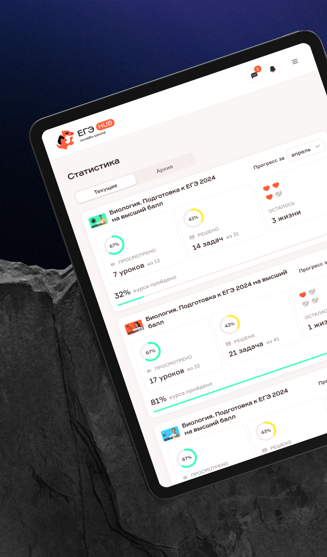 В разделе «Статистика» ученик видит прогресс по курсам за месяц или весь период: сколько уроков пройдено и осталось, сколько домашних заданий выполнено и сколько ещё предстоит.