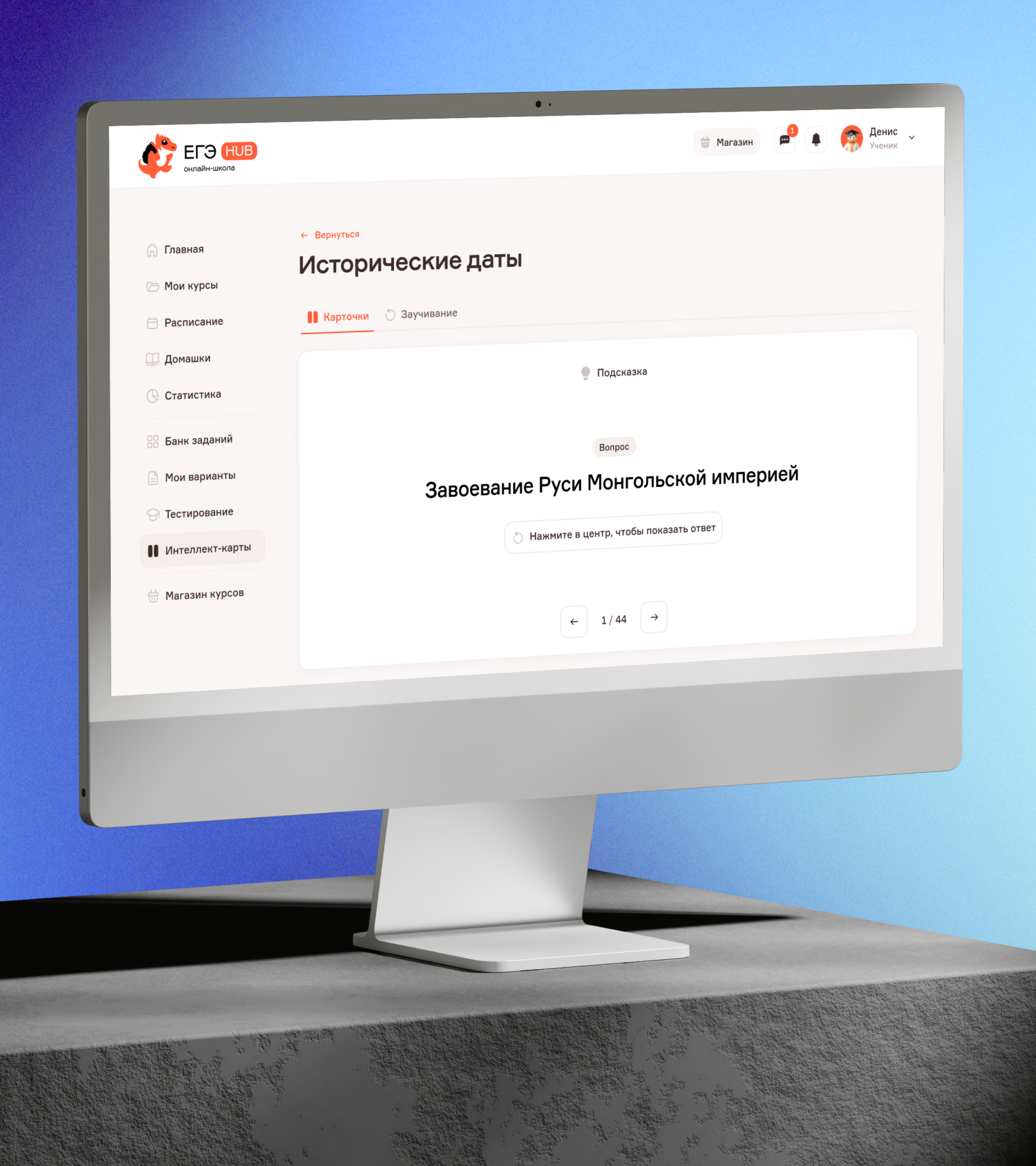 - Интеллект-карты. Раздел с карточками по предметам приобретённых курсов. Доступны два формата изучения: «Вопрос-ответ», где ученик отвечает и переворачивает карточку для проверки, и «Заучивание», где система отслеживает прогресс по изученным карточкам. Карточки не содержат подсказок, а решения проверяются платформой.