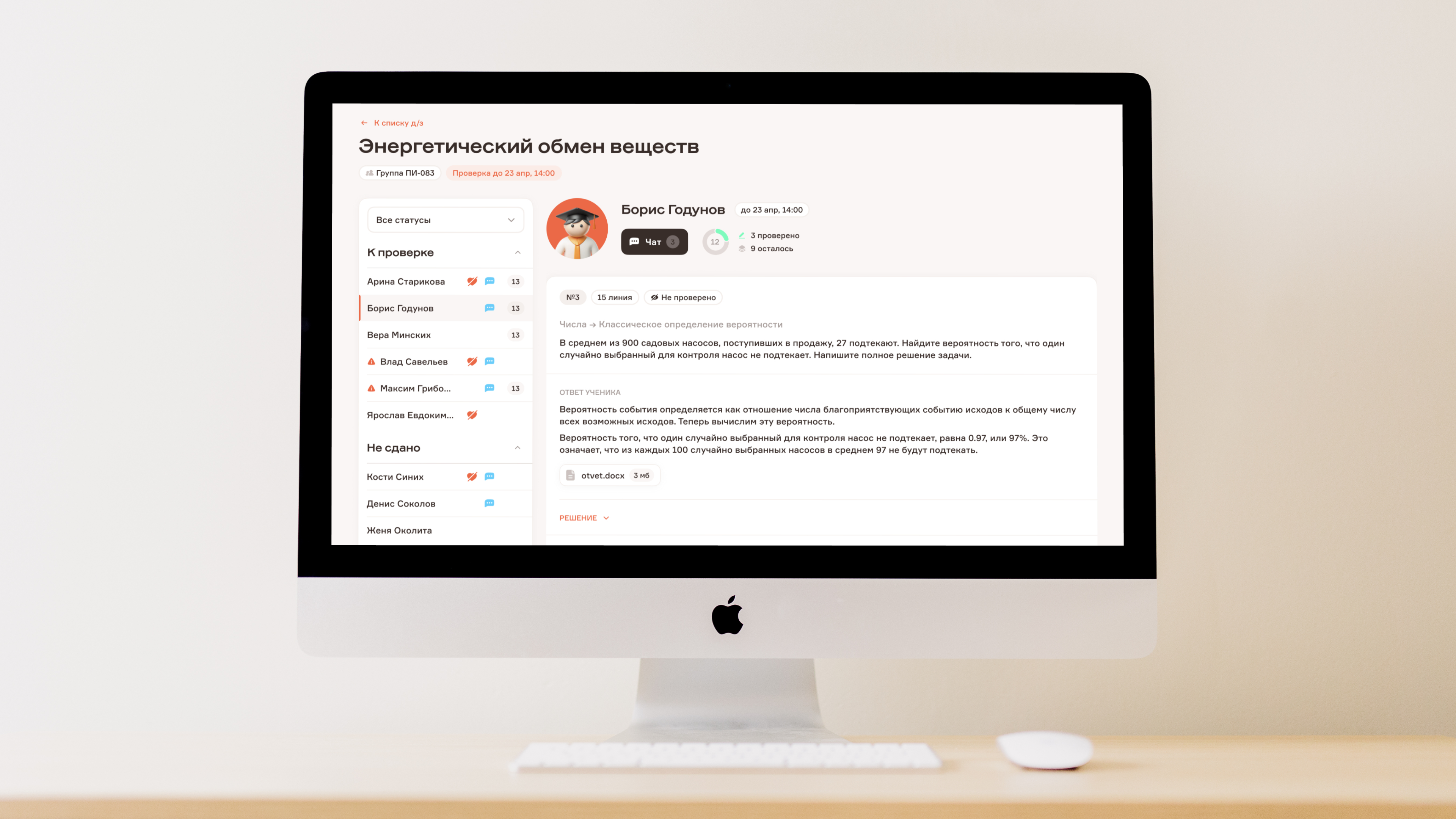 Интерфейс проверки удобен и функционален. Слева расположен список учеников, разделённых по статусам: «к проверке», «не сдано», «завершено». Индикаторы показывают сообщения в чате, просроченные задания и потерянные «жизни». Потерянные жизни сигнализируют, что ученик испытывает трудности и нуждается в помощи.