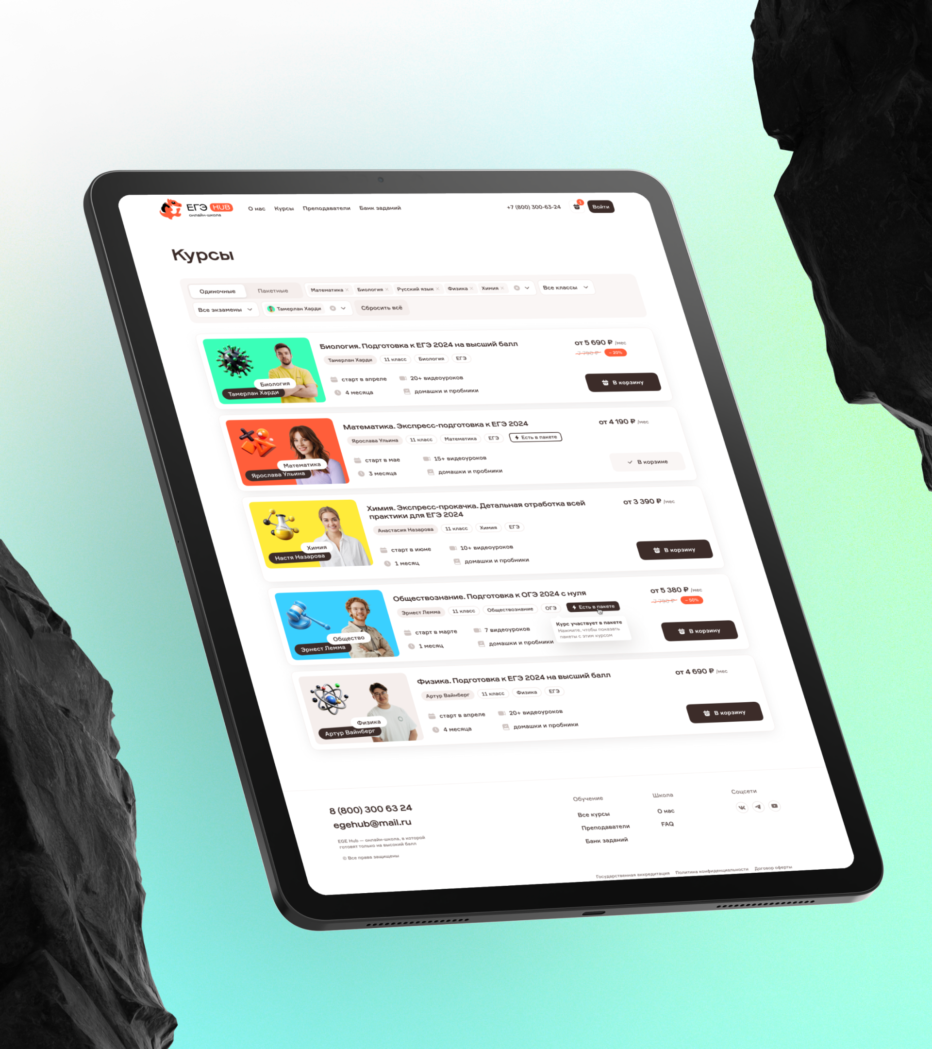 В разделе представлены все доступные к покупке курсы онлайн-школы с фильтром по предмету, классу, экзамену, преподавателю.