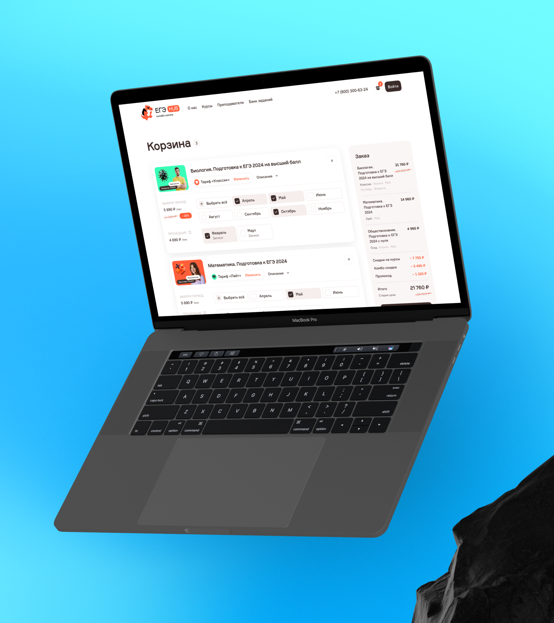 Мы спроектировали карточку курса со сложным интерфейсом, где показали матрицу выбора периода, условия покупки, тарифы, цены со скидкой и без, а также поле для промокода. В результате процесс выбора и оформления курсов стал удобным и понятным для пользователя.