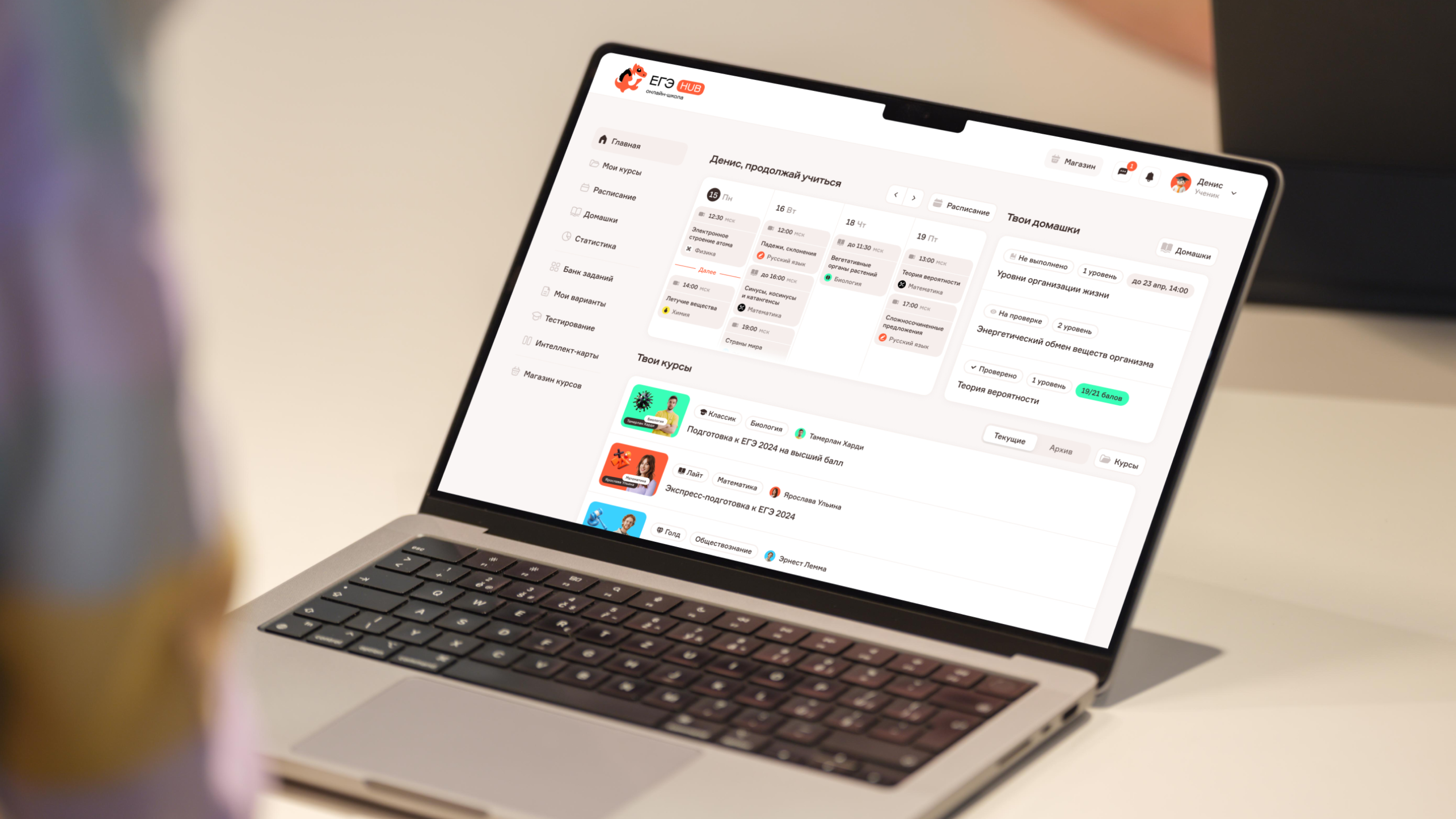 На главной странице личного кабинета ученик видит всё самое важное: Календарь с расписанием на ближайшие дни, домашние задания и доступные курсы.