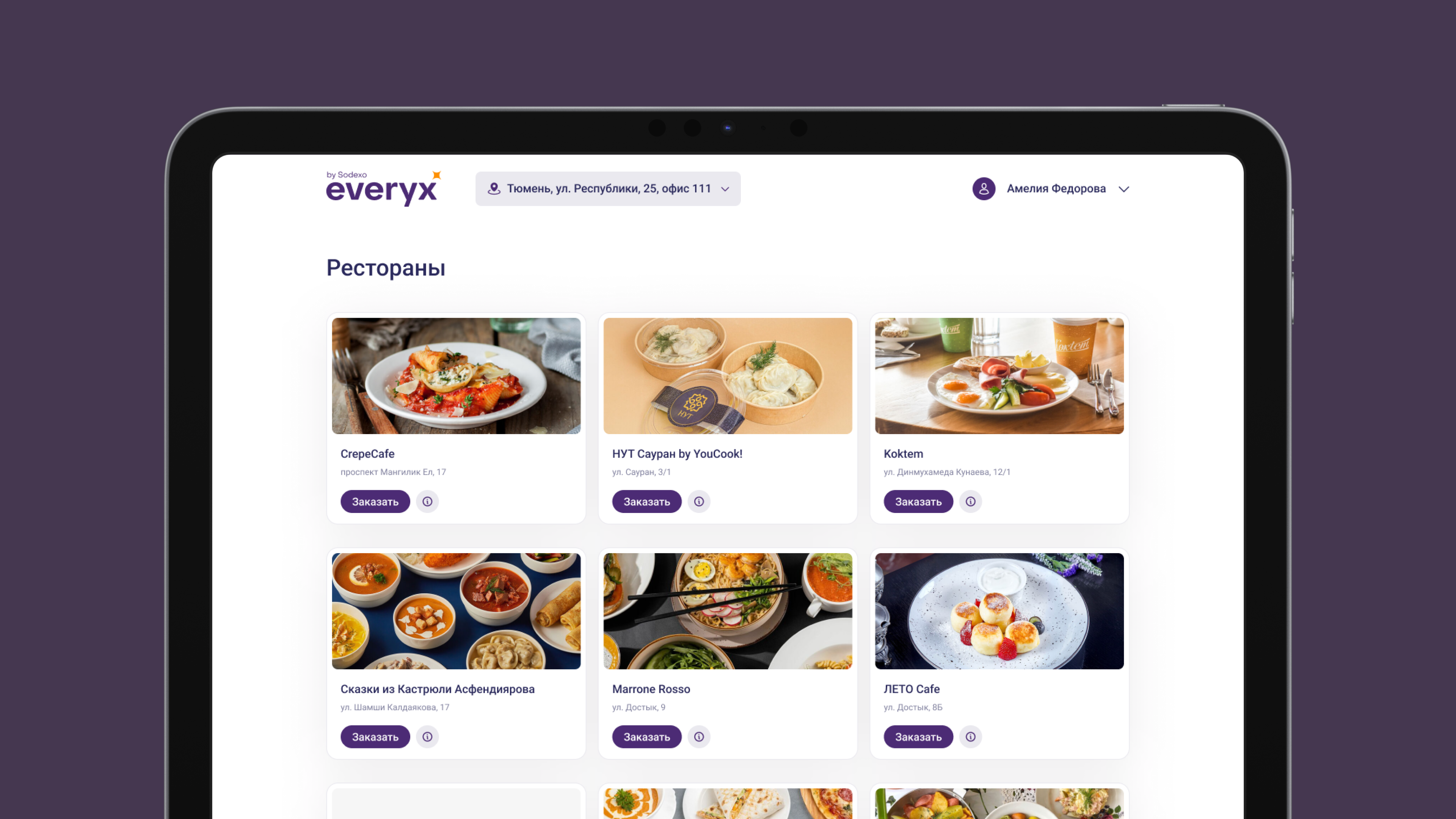 В сервисе реализован удобный каталог ресторанов и кафе, где сотрудники могут выбрать подходящее заведение для заказа питания. Каждая карточка содержит фото блюд, адрес и кнопку быстрого оформления заказа.
