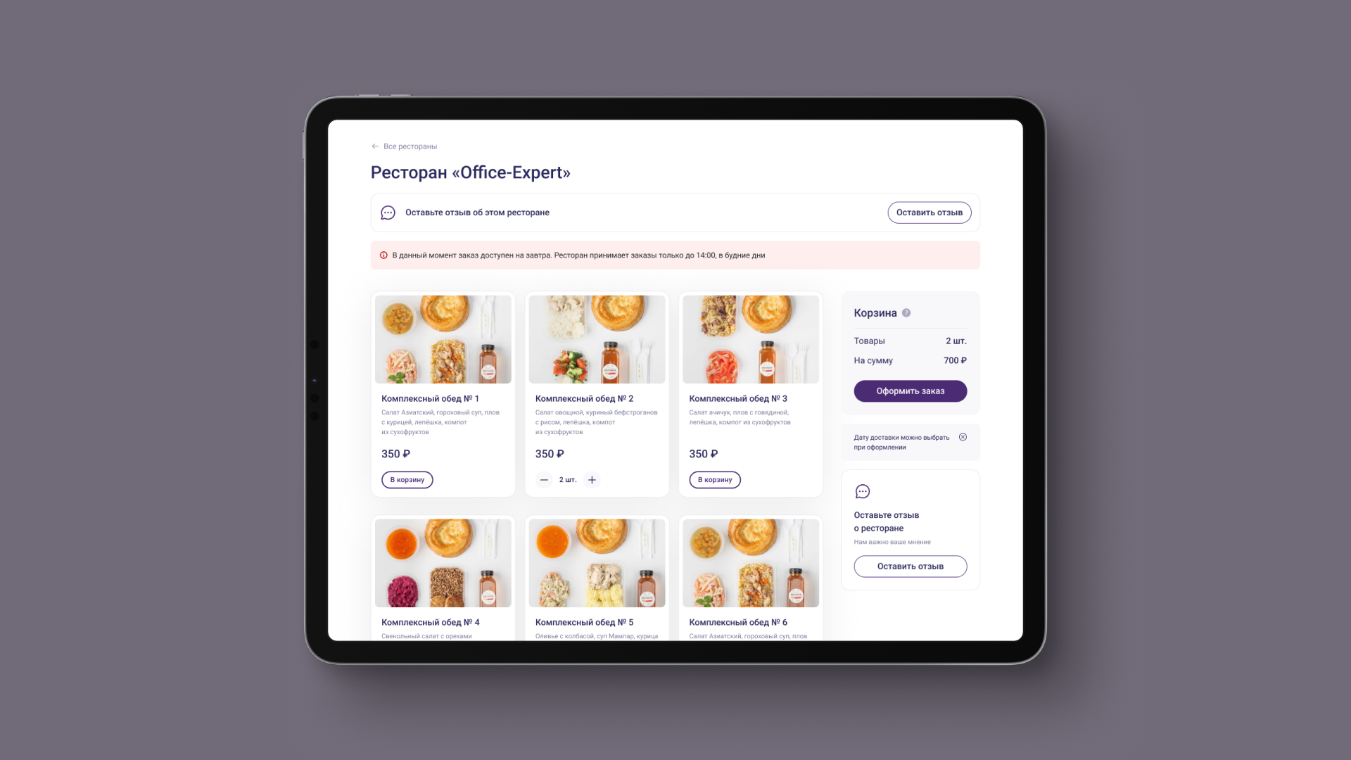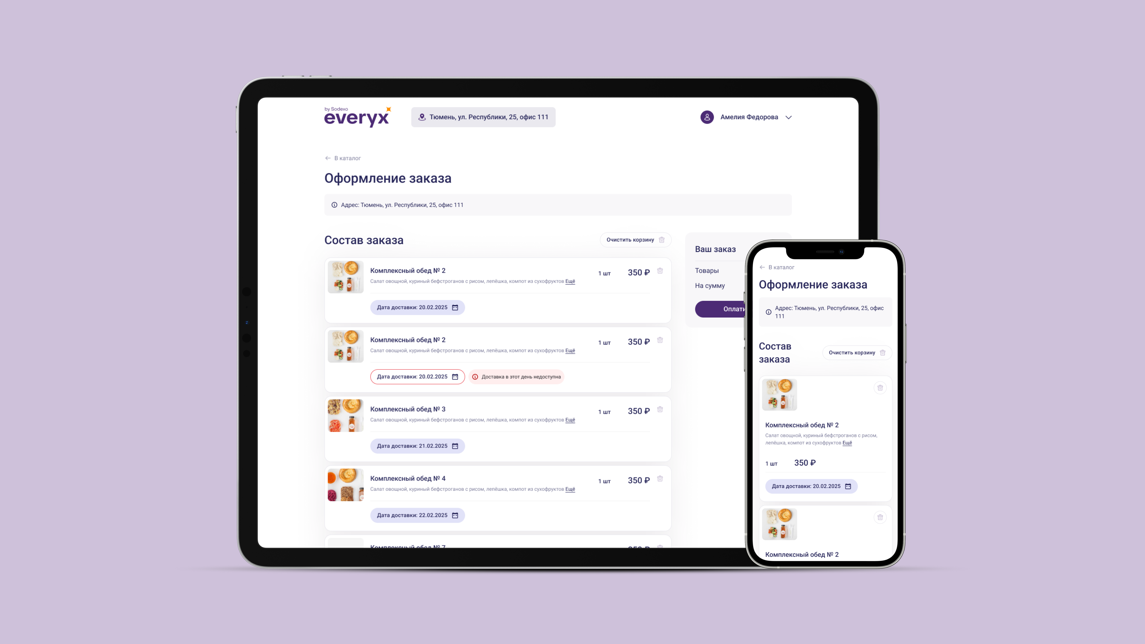Интерфейс одинаково удобно работает как на десктопе, так и на мобильных устройствах, что позволяет сотрудникам планировать питание в любое время и оформлять заказ в несколько шагов без лишних действий.