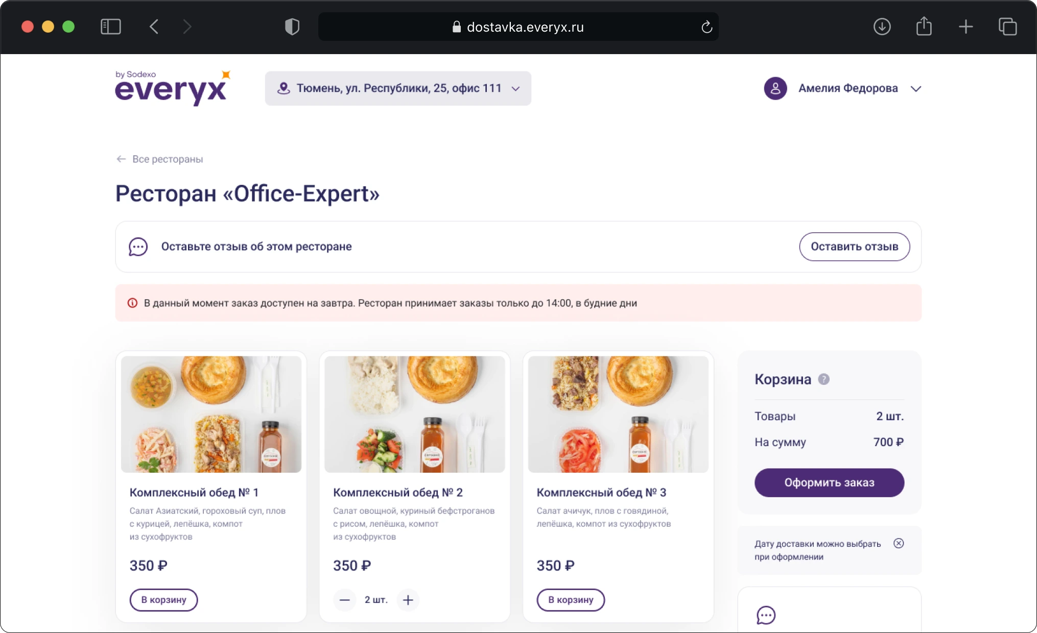 Этап оформления заказа построен так, чтобы процесс был максимально простым и прозрачным. Пользователь видит полный состав заказа с фотографиями блюд, описанием, ценой и датой доставки.
