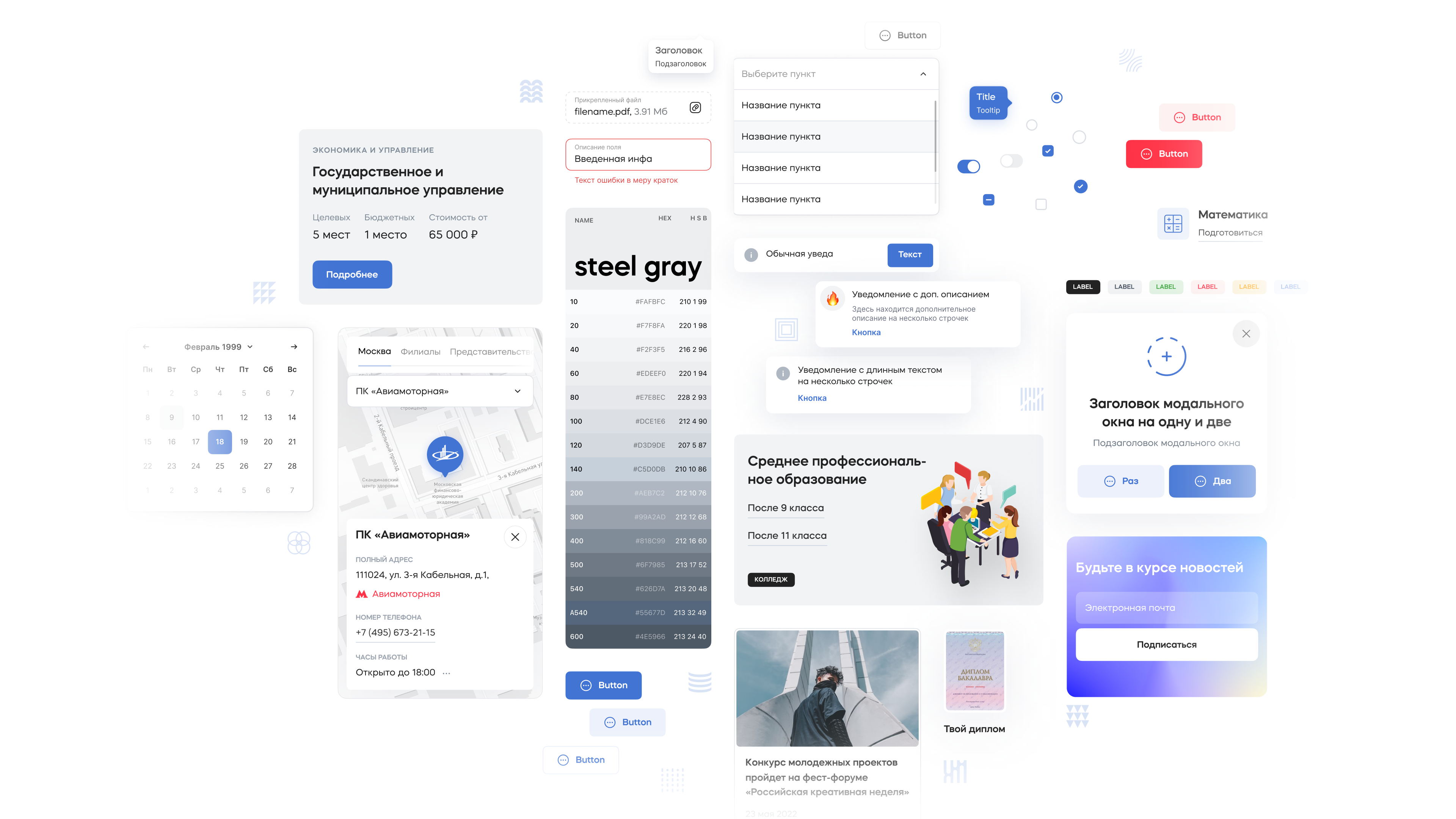 - прежняя версия основного сайта Университета содержала больше 10 000 страниц с контентом. конечно, мы это сократили, распределили, но получилось все равно много. чтобы не сойти с ума, на этапе дизайна мы создали систему универсальных блоков, которые повторяются на страницах в разных видах и комбинациях