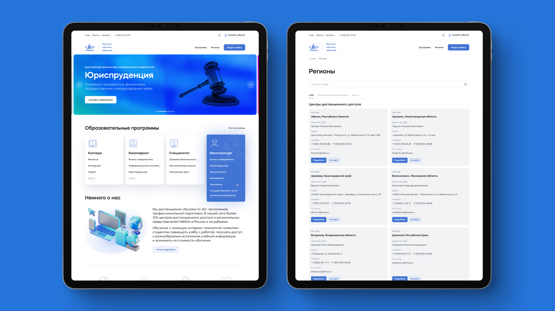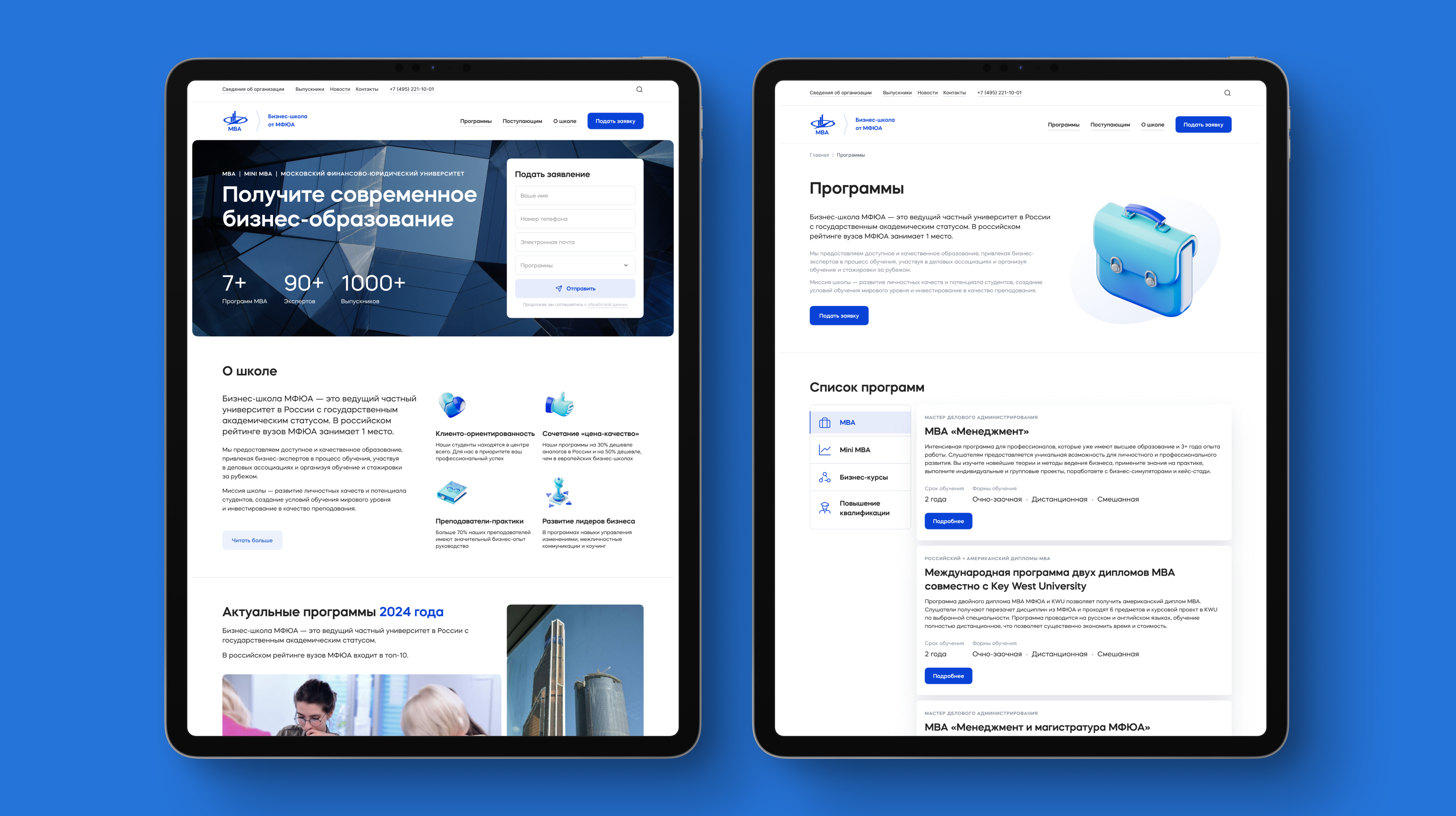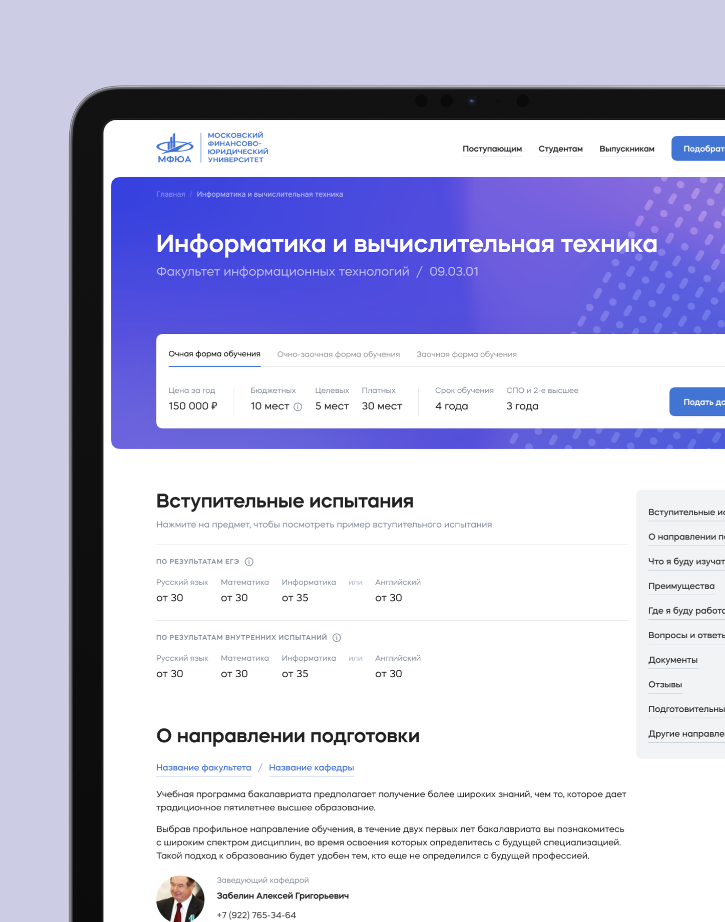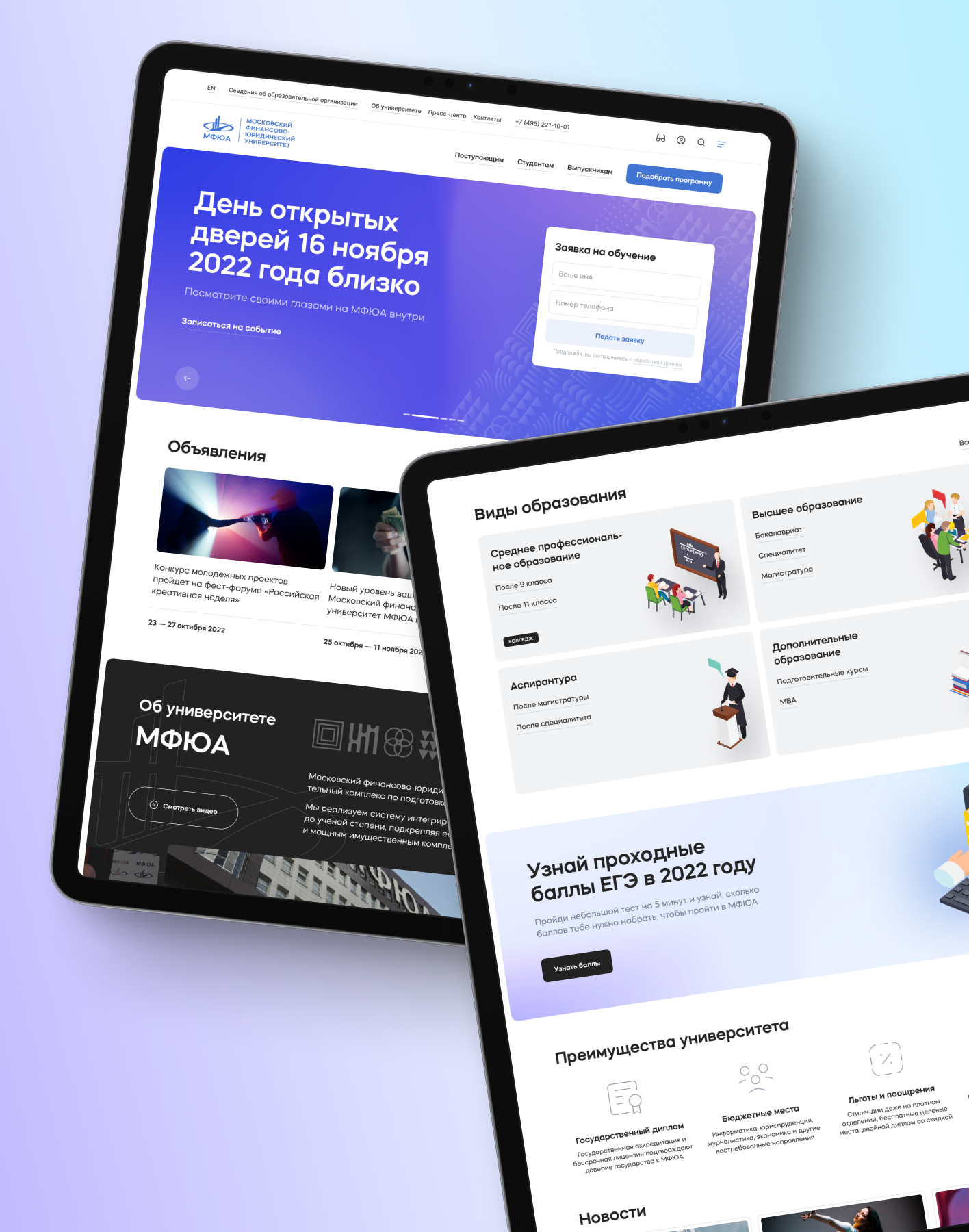 На базе дизайн-системы провели полный редизайн главного сайта МФЮА. Основной упор сделан на удобство отображения программ обучения так, чтобы пользователи могли легко найти и понять весь процесс поступления.