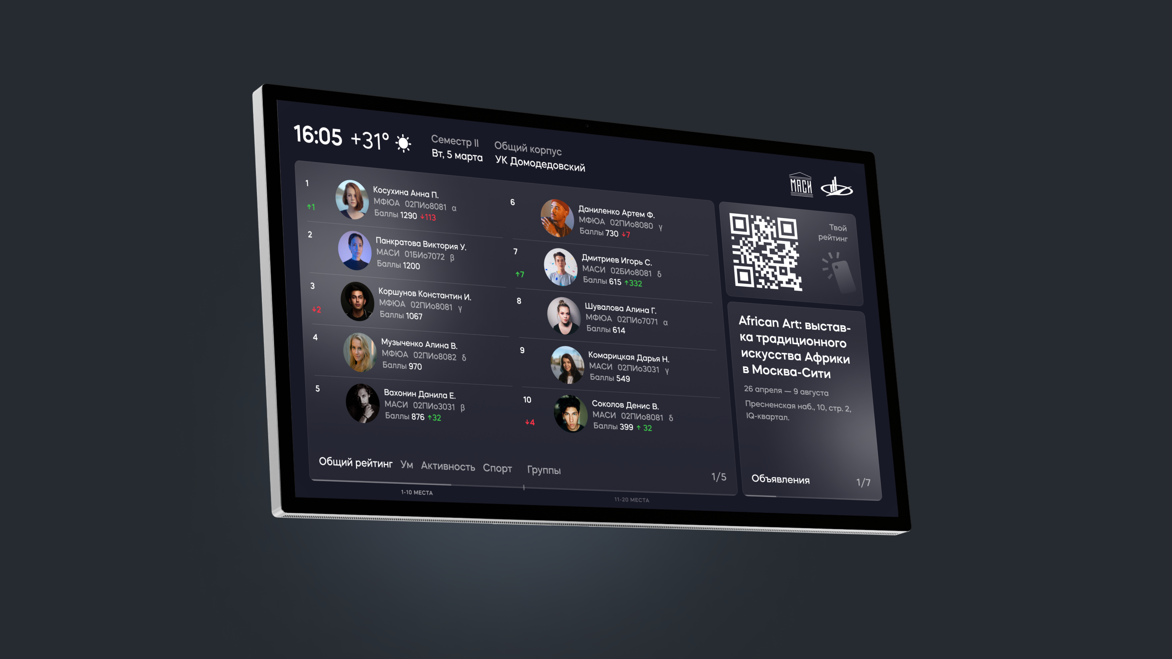 Отображается на LED-экранах. Рейтинг позволяет отслеживать ранг студентов в зависимости от их общих достижений, успехов в учёбе и спорте.