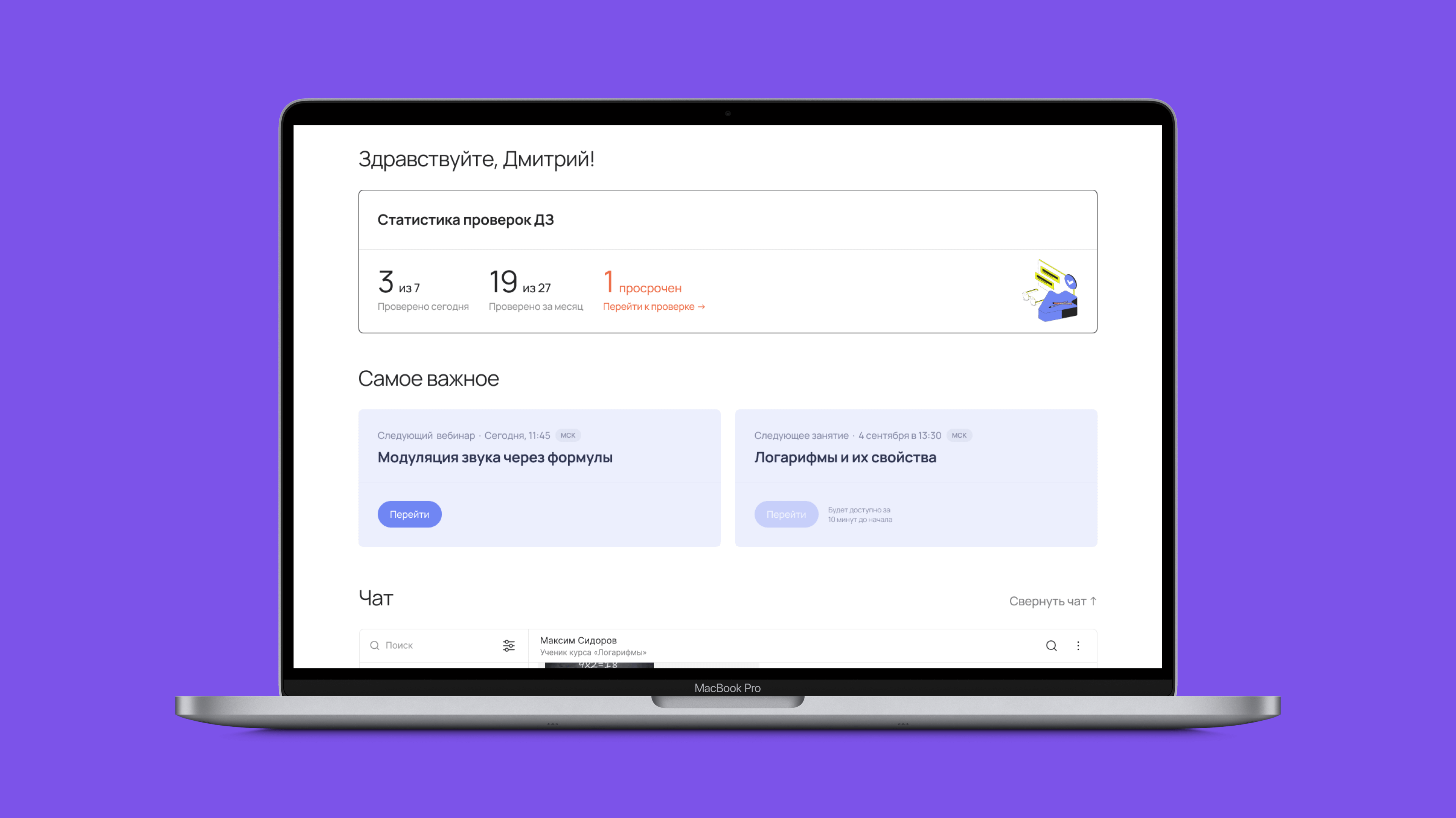 Основная задача куратора — проверять домашние задания, проводить консультации и помогать ученикам через чат платформы.