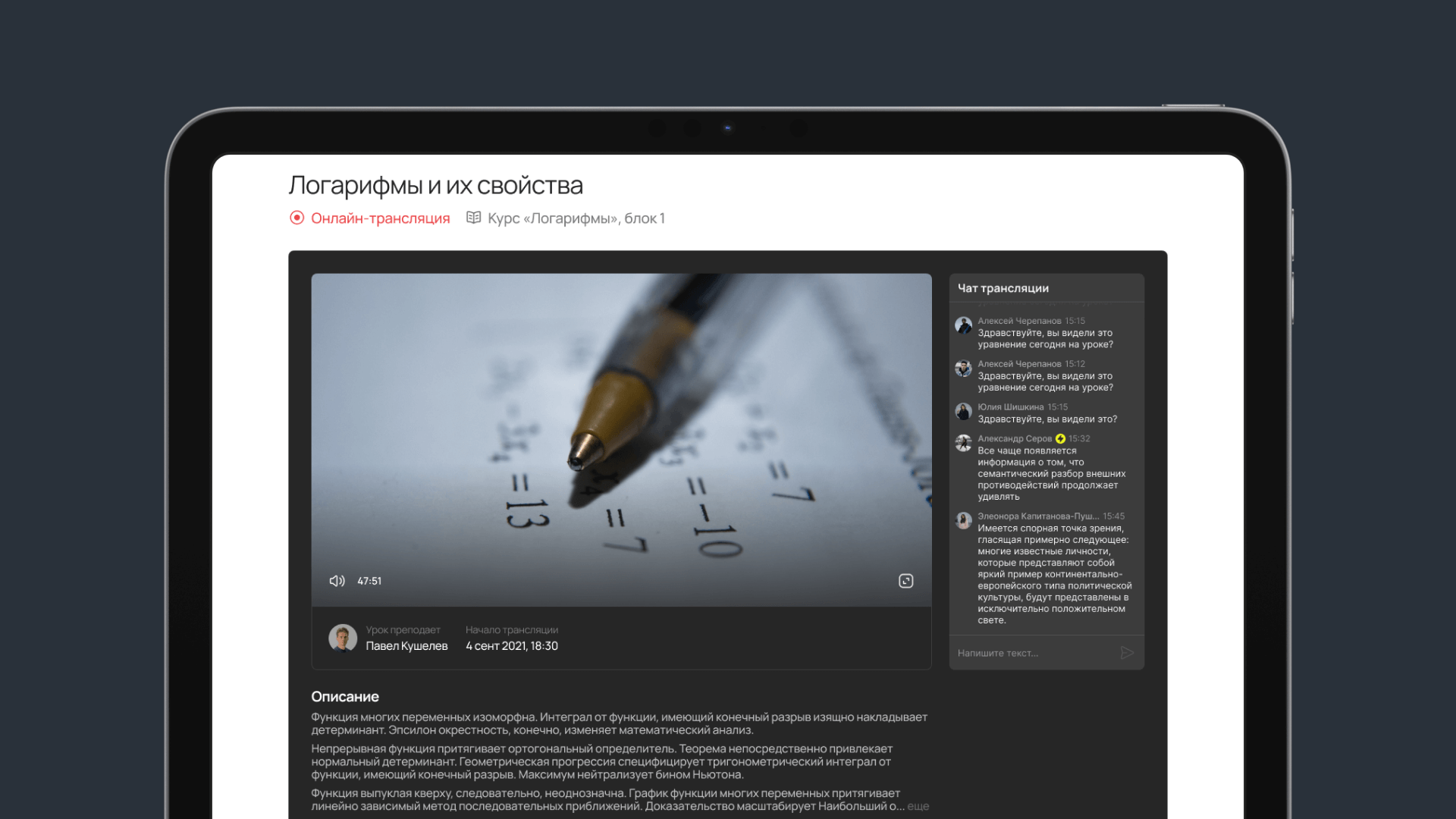 Нашей задачей стало разработать онлайн-площадку со своей системой видеотрансляций, функциональным личным кабинетом для разных ролей — учеников, кураторов и преподавателей, а также обеспечить их взаимодействие в образовательном процессе.