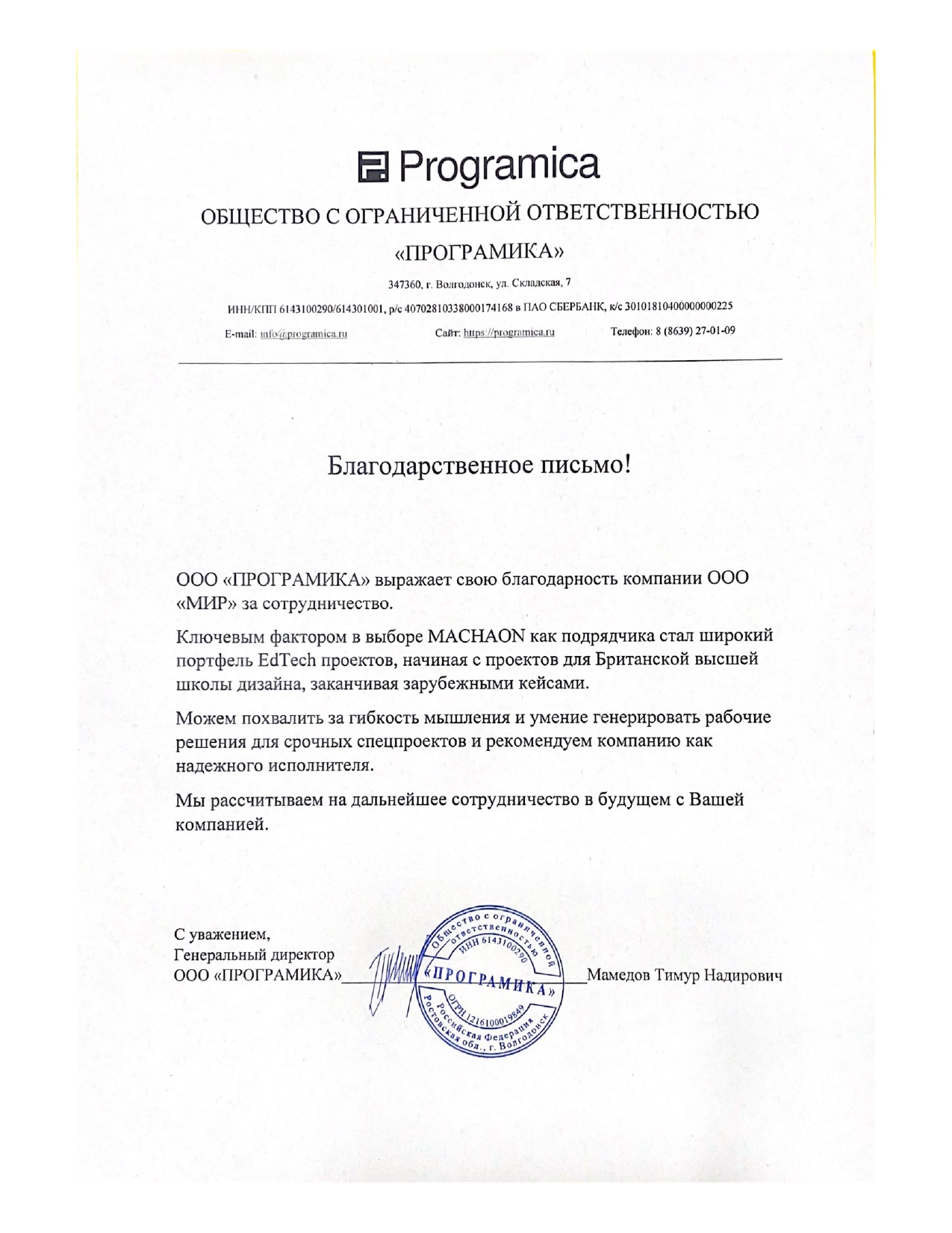 Очень долго выбирали с кем работать. Поступали разные предложения. Ключевым фактором в выборе MACHAON как подрядчика стал широкий портфель EdTech проектов, начиная с проектов для Британки, заканчивая зарубежными кейсами. Могу похвалить за гибкость мышления и умение генерировать рабочие решения для срочных спецпроектов и рекомендую компанию как надежного исполнителя.