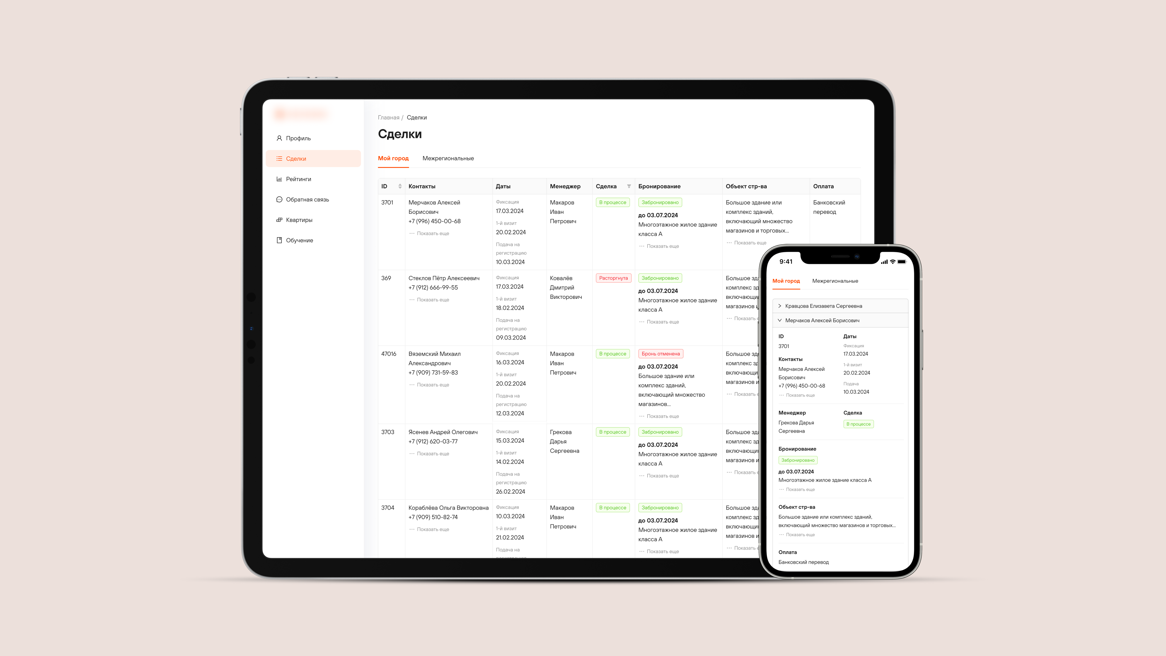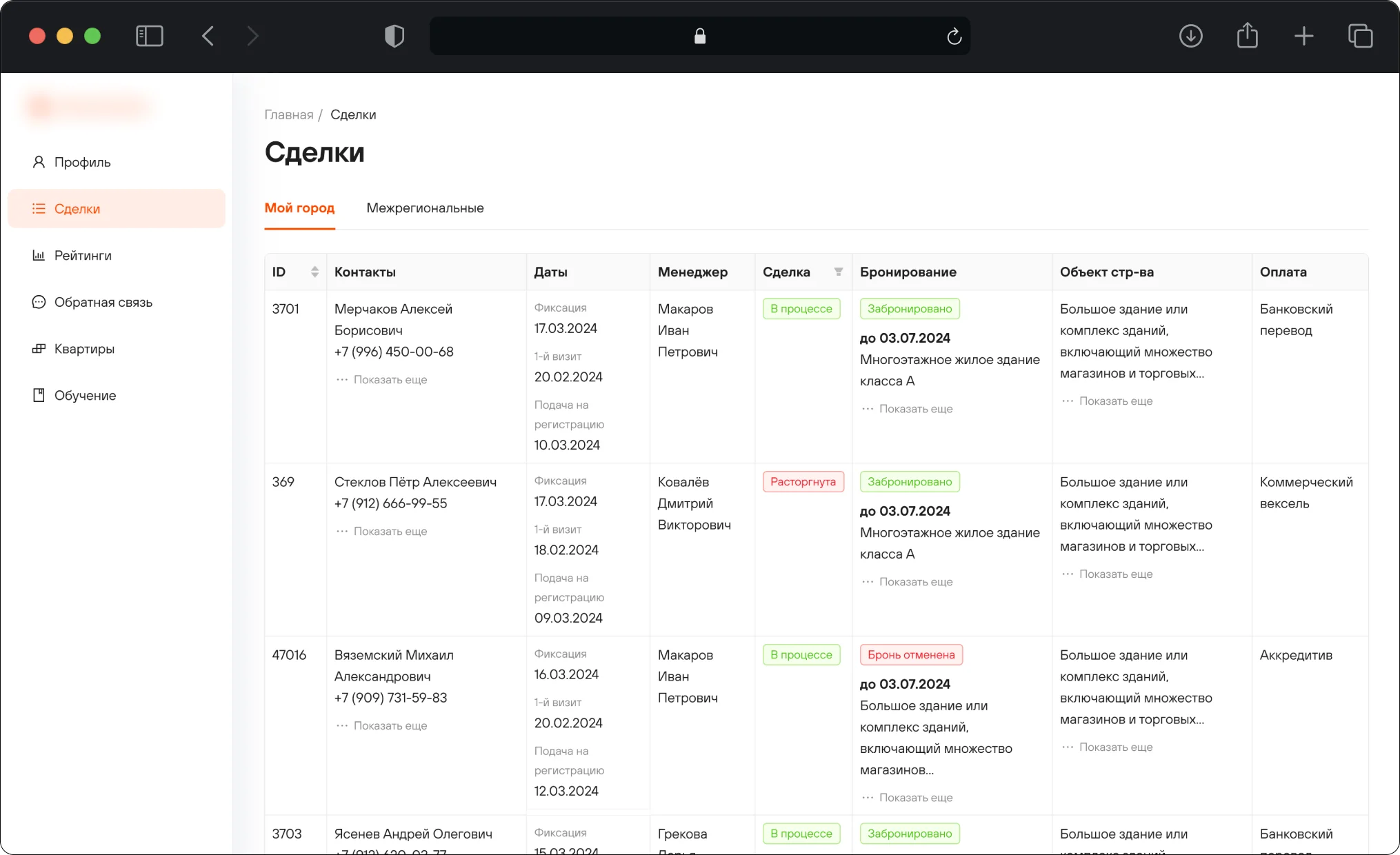 С помощью разработанного сервиса Заказчик обеспечил риэлторов основным инструментом для ведения сделок. Теперь весь процесс продажи недвижимости от первого обращения и брони за клиентом до получения оплаты удобно вести и контролировать в одном месте.