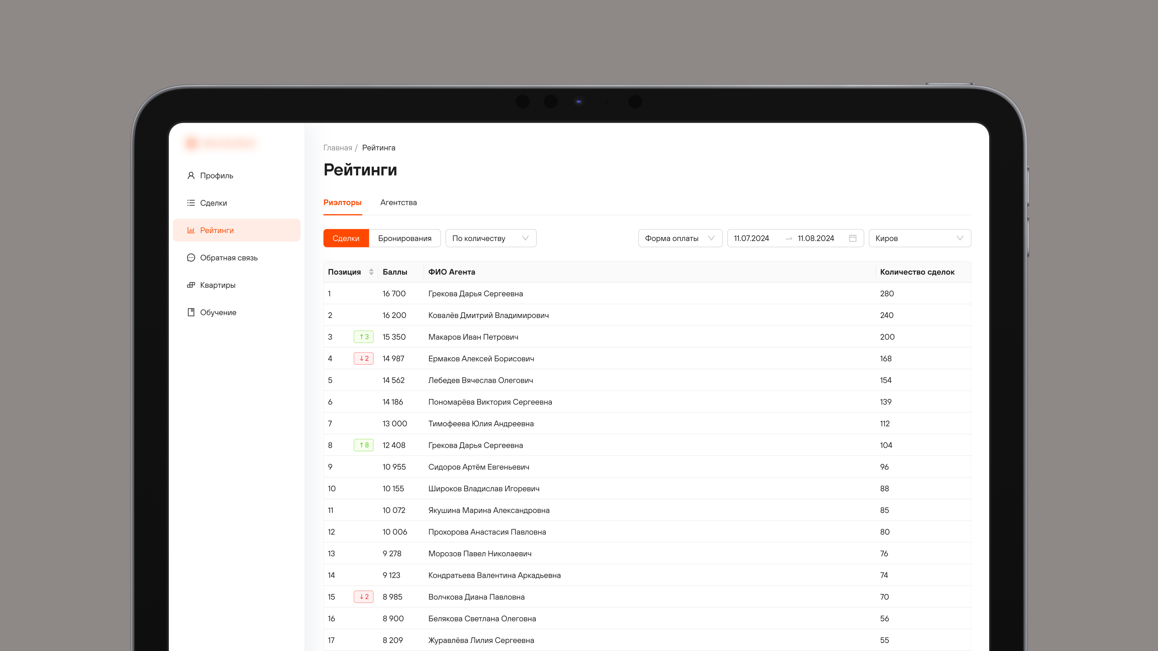 Риэлтор может посмотреть рейтинг за разные периоды времени. Система выдаёт список с позициями и количеством баллов, показывает динамику прироста или падения по сравнению с предыдущим таким же периодом.