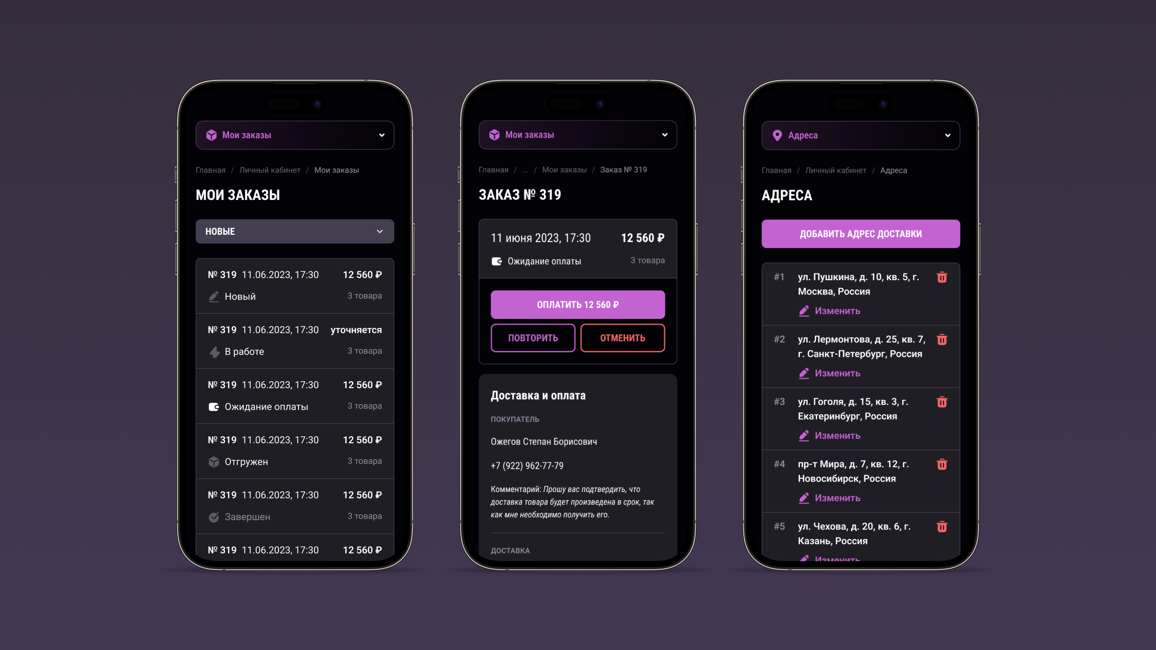 - просмотр, сортировка и отслеживание всех предыдущих заказов, включая детали, статусы, суммы, даты