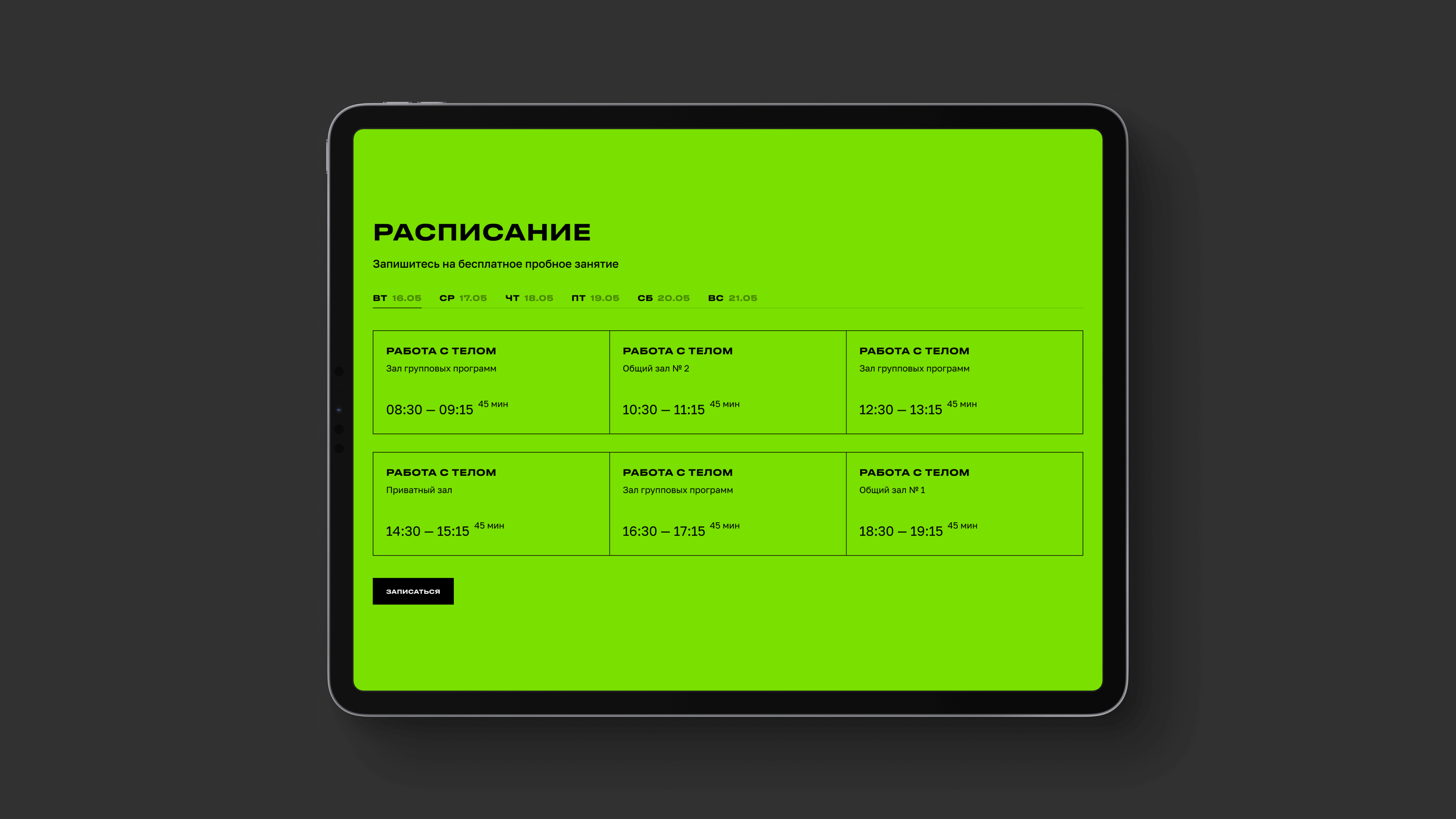 За основу мы взяли фирменный стиль и предоставленный UI-kit от XFIT. Соблюдение единой стилистики и одинаковых интерфейсных решений — одно из правил франшизы. Преобладающая цветовая гамма: яркий зеленый цвет на контрасте с черным.
